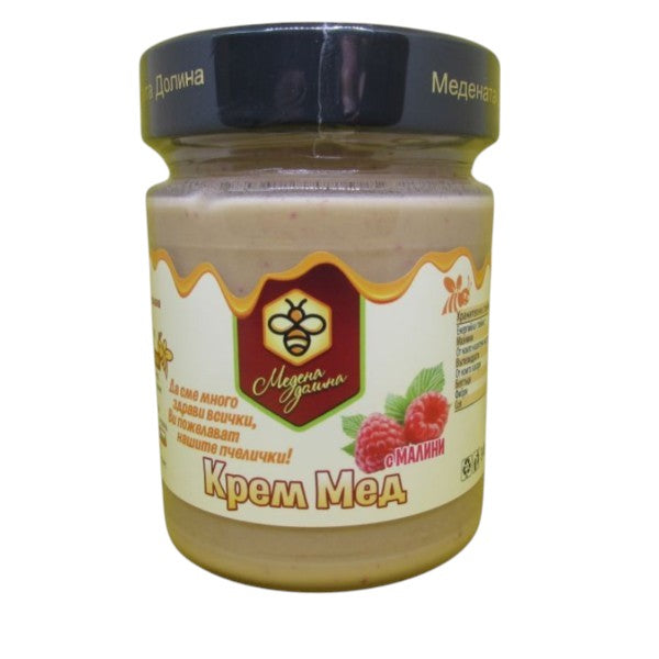 Крем медът се отличава със своята фина, кремообразна консистенция и лек розово-червен нюанс, постигнат благодарение на естествения цвят на малините.