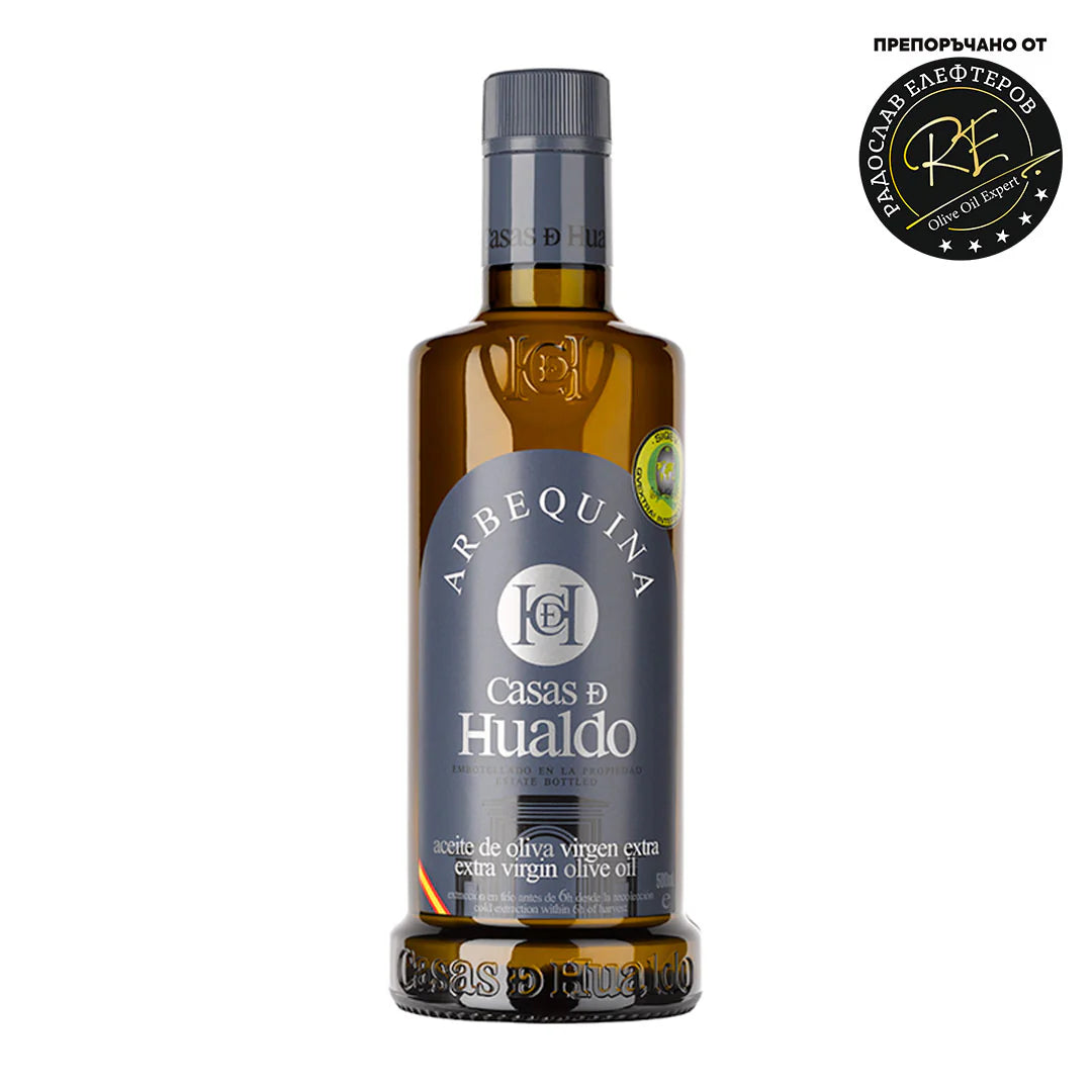 Маслиновото масло ARBEQUINA, от CASAS DE HUALDO е хармонично, ароматно и деликатно. Сребристият цвят на етикета му говори за неговата елегантност и финес. Пълен с аромати, той предизвиква усещане за артишок, трева и домати, поражда хармонично и ароматно цяло. Маслината е мека, сладка и фина Arbequina. Зехтинът е създаден чрез студено извличане в рамките на 6 часа след прибиране на реколтата, за да се осигури висока хранителна и сензорна стойност. Подходящ за всички видове ползване, екологично чист натурален продукт, без примеси, оцветители и ГМО. Подходящ за вегани.